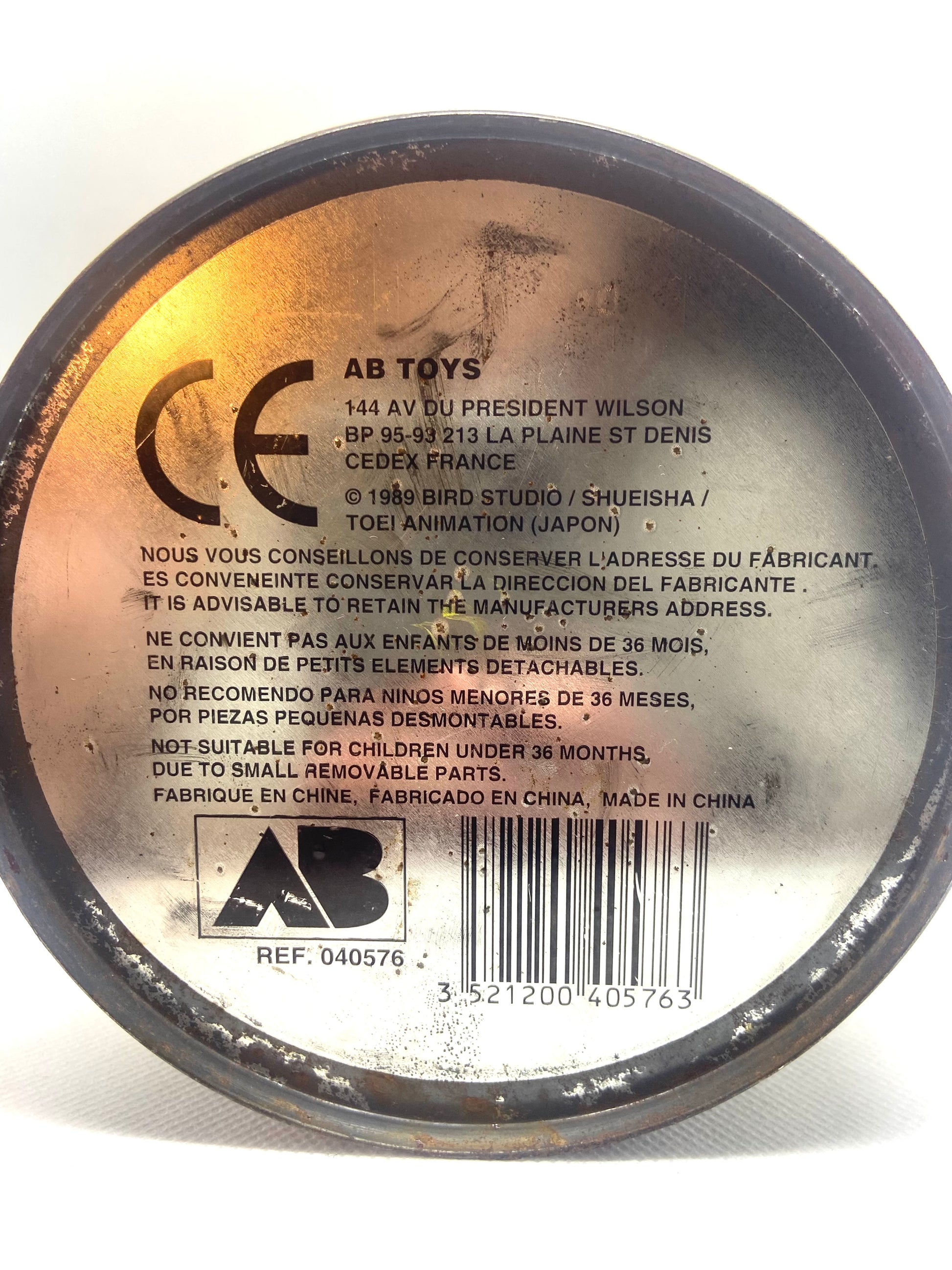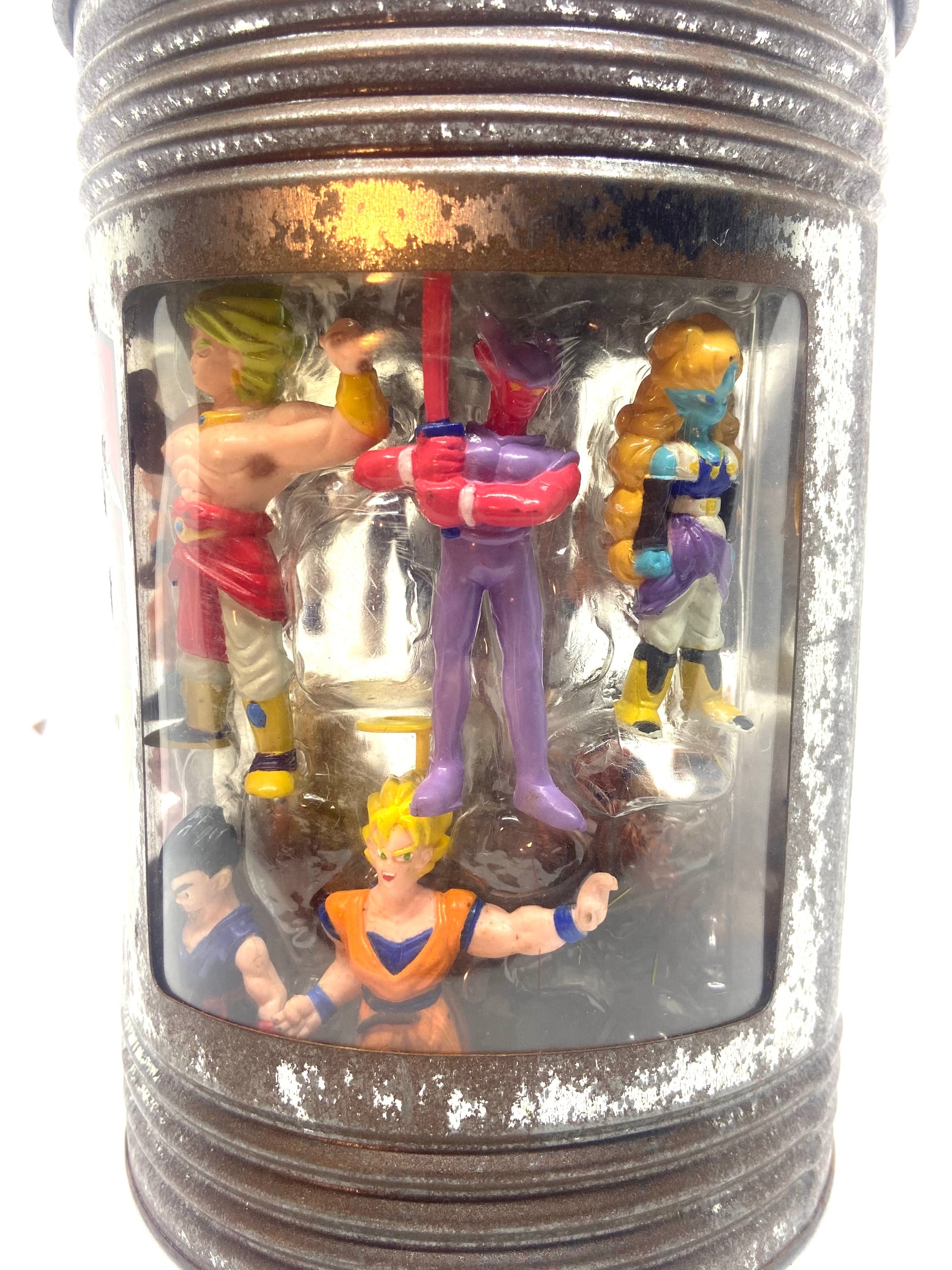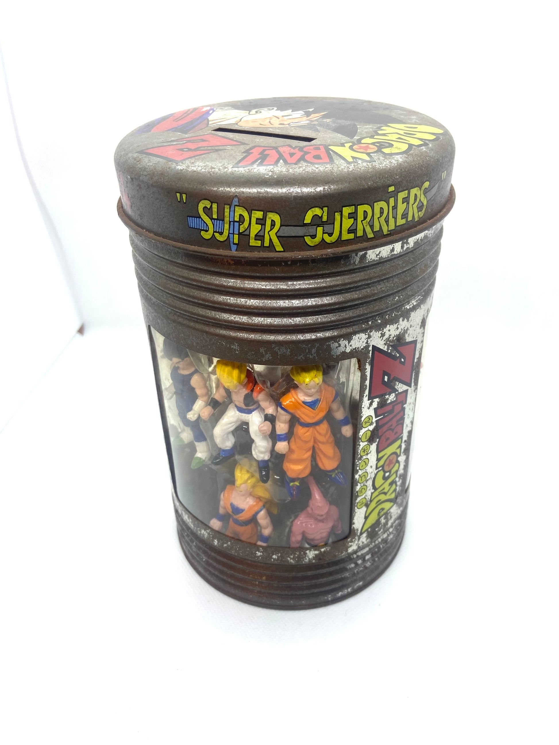 Tirelire Métallique Dragon Ball Z - AB Toys, cale pour figurine bien présent et d'origine. Boite / Tirelire paru en 1989. Il manque 2 figurines dans les cales plastiques.